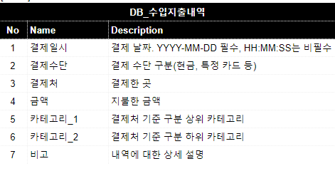 결국 가계부에 기입해야 하는 내용이 입/출금 내역인 경우가 많아 금융 어플에서 제공하는 엑셀 내보내기 기능에서 생성되는 데이터 구조를 많이 참고했다.