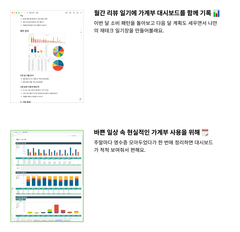 | 예시 | 토스, 뱅크샐러드, 유플래너 | 편한가계부, 똑똑가계부,부부 | 가계부 노트, 가계부 서적 | 엑셀 템플릿, 노션 템플릿 |