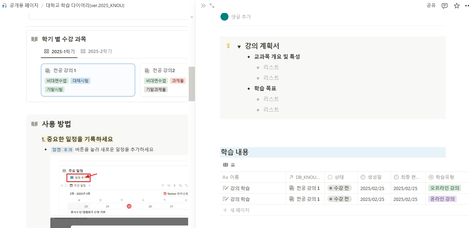 그래서 이왕 하는 김에, 템플릿으로 만들어서 배포해보면 어떨까 싶어서 내가 쓰는 방송대 다이어리를 간소화해서 템플릿으로 등록했다.