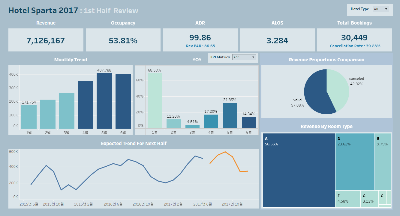 - 최종 프로젝트 결과물 대시보드는 아래에. 주요 KPI인 객실 점유율(Occupancy)가 정확한 값으로 산출할 수 없었던 게 너무 아쉽다. 우리에게 주어진 데이터 내에서 최대한 활용하여 어떻게든 만들어 냈지만... 캐글에 올라오는 데이터는 아무레도 무기명 처리를 거치고 모든 정보가 주어지는 것이 아니다보니 여러모로 아쉬움이 남을 때가 많다.