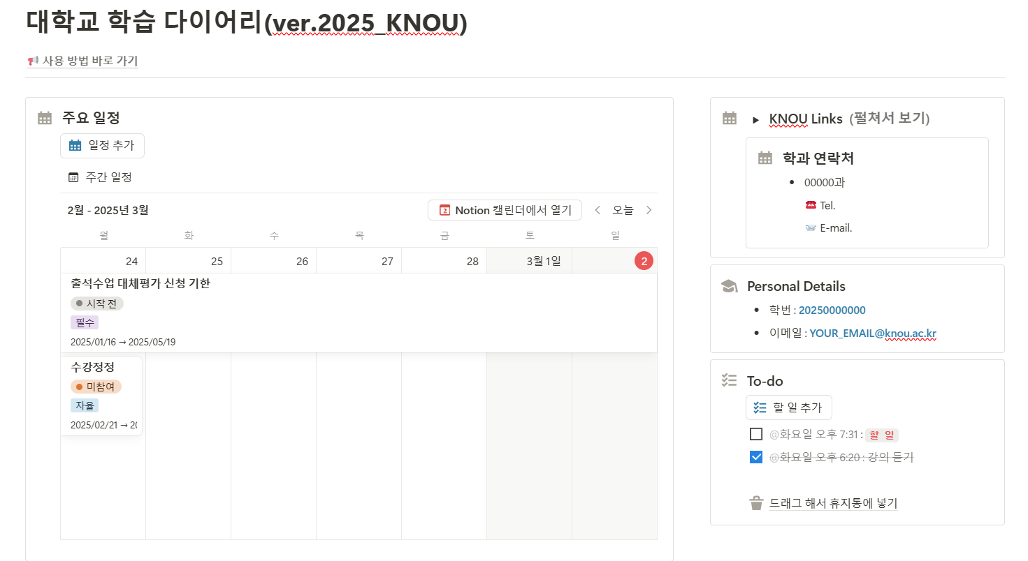 25학번으로 통계 데이터학과에 편입하고 제일 먼저 했던 게 바로 방송대 관련 링크 수집해서 정리하기였다. 왜냐면!방송대는!!전부 셀프 & 온라인으로 진행되기 때문이다!!! 물론 친절한 학생회 임원분들께서 OT도 준비해주셨고,신입/편입생의 경우 한 학기동안 담당 튜터님이 배정되어 질문을 계속 받아주시지만매번 찾아다닐 수는 없는 노릇이다. 웬만한 링크는 다 찾아놨으니, 혹시 나같은 방송대 신입생/편입생이라면 참고하시길! 1. 학교 홈페이지 : 방송대의 메인 홈페이지. 방송대 관련 주요 공지사항, 학사 관련 정보가 있다. 2. 학사정보모바일(학부생 포털) : 수강신청, 출석수업의 유형/지역 변경, 과제물 제출, 성적 조회, 등록금 납부여부 등 확인 가능ios & Android 의 MyKNOU 앱과 UI..